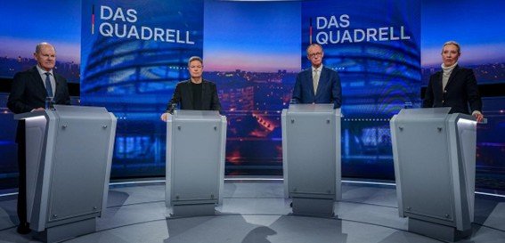 Lá estavam, na reta final pelo apoio nas urnas, no próximo domingo 23 de fevereiro, o atual chanceler Olaf Scholz, do SPD, de centro-esquerda; seu principal rival Friedrich Merz, do bloco conservador CDU/CSU (que lidera a corrida com folga); Alice Weidel, do partido de extrema direita Alternativa para a Alemanha (AfD); o vice-chanceler Robert Habeck, dos Verdes.