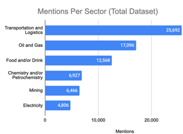 Dentre as 100 maiores empresas do Brasil, as que pertencem ao setor de transportes e logística são as que mais receberam atenção da imprensa estrangeira entre janeiro do ano passado e março de 2024. Estudo da Imagem Corporativa em parceria com a Grady College da Universidade da Georgia mostra que empresas da área tiveram mais de 25 mil menções em veículos de imprensa (portais, revistas, rádios etc.) no período, contra cerca de 17 mil do setor de petróleo e gás, que fica em segundo lugar. Indústrias de alimentos e bebidas também superam o patamar de 10 mil menções e figuram na terceira colocação.
