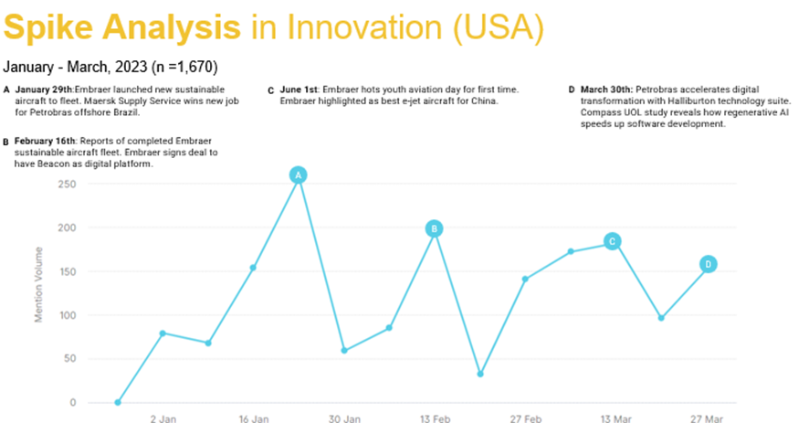 A expansão da rede de serviços e portfólio da Embraer e suas iniciativas na busca por tecnologia limpa para aviação sustentável destacam-se nesse vetor, tanto na imprensa norte-americana quanto na europeia. Nos EUA, Compass UOL conquista espaço relevante no contexto de modernização tecnológica de serviços financeiros.