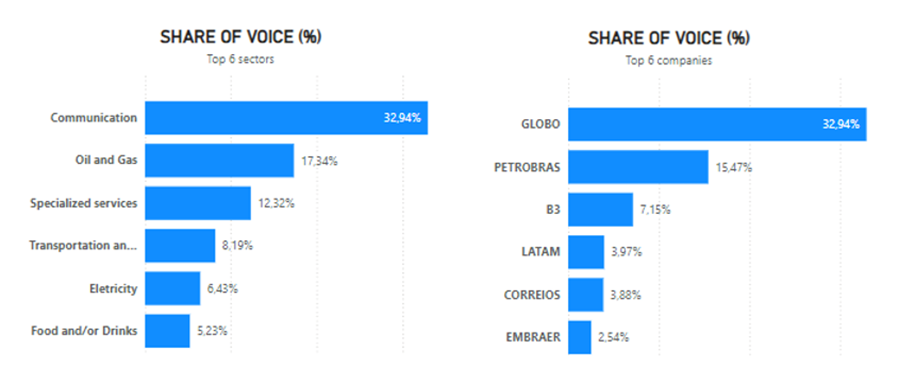 Transporte e logística fica em quarto lugar (8%) e o setor de comunicação assume a ponta (com 33%), seguido pelo de petróleo e gás (17%). O resultado tem correlação com o desempenho do Grupo Globo tanto por conta de seus canais proprietários quanto pela repercussão de conteúdos, como o do Big Brother Brasil, por exemplo.