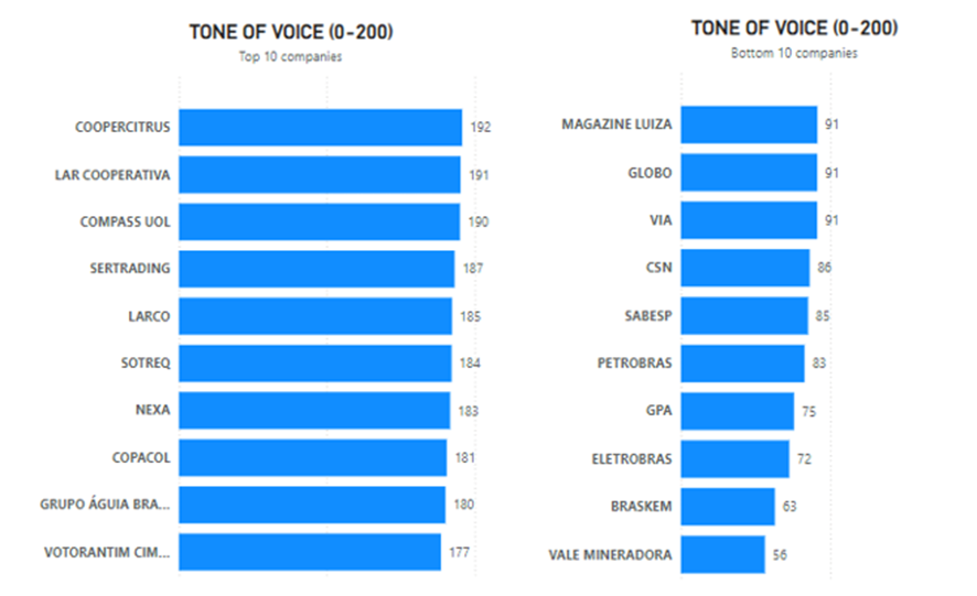 As empresas com melhor imagem têm número de menções abaixo da média, com alcance muitas vezes restrito a publicações do trade. Há exceções – Coopercitrus, que chega a 192 pontos de Tone of Voice também consegue o escore ao tratar de temas como “fertilizantes sustentáveis” em veículos da grande imprensa, por exemplo.