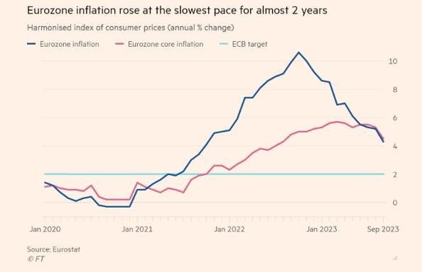 A taxa de inflação anual da zona do euro caiu para 4,3% em setembro, a taxa mais baixa em quase dois anos. Trata-se da confirmação de uma queda gradativa mas consistente.