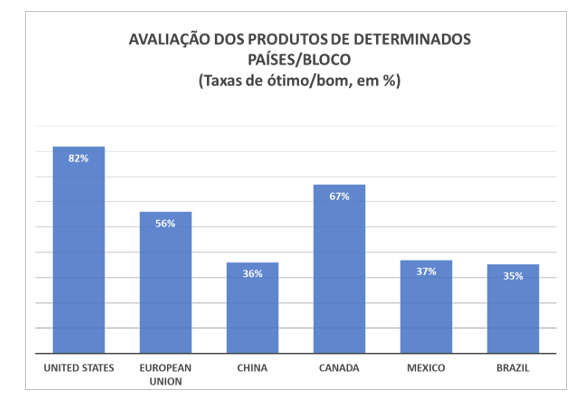 Segundo o levantamento, os produtos que carregam o label “Made in USA” são considerados ótimos ou bons por 82% dos entrevistados, enquanto os canadenses recebem a avaliação positiva de 67%. Taxas bem mais baixas são verificadas na percepção que americanos demonstram sobre a qualidade de produtos fabricados na China, México e Brasil. Nesses casos, os índices de aprovação caem para 36%, 37% e 35%, respectivamente.